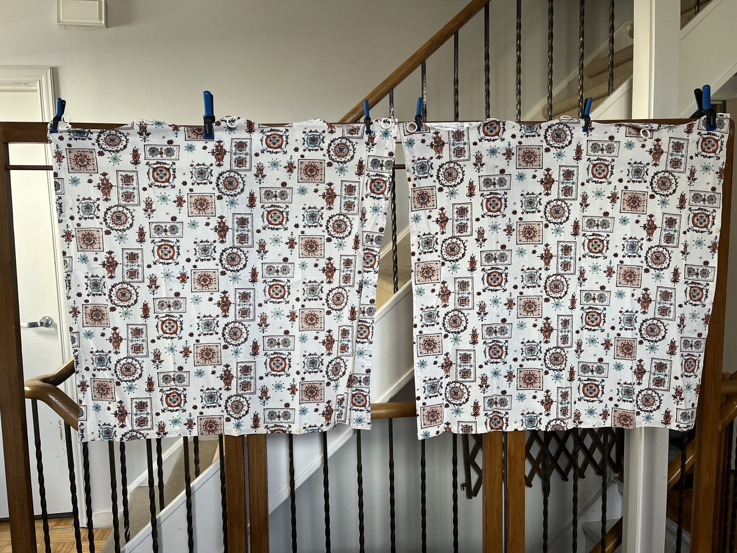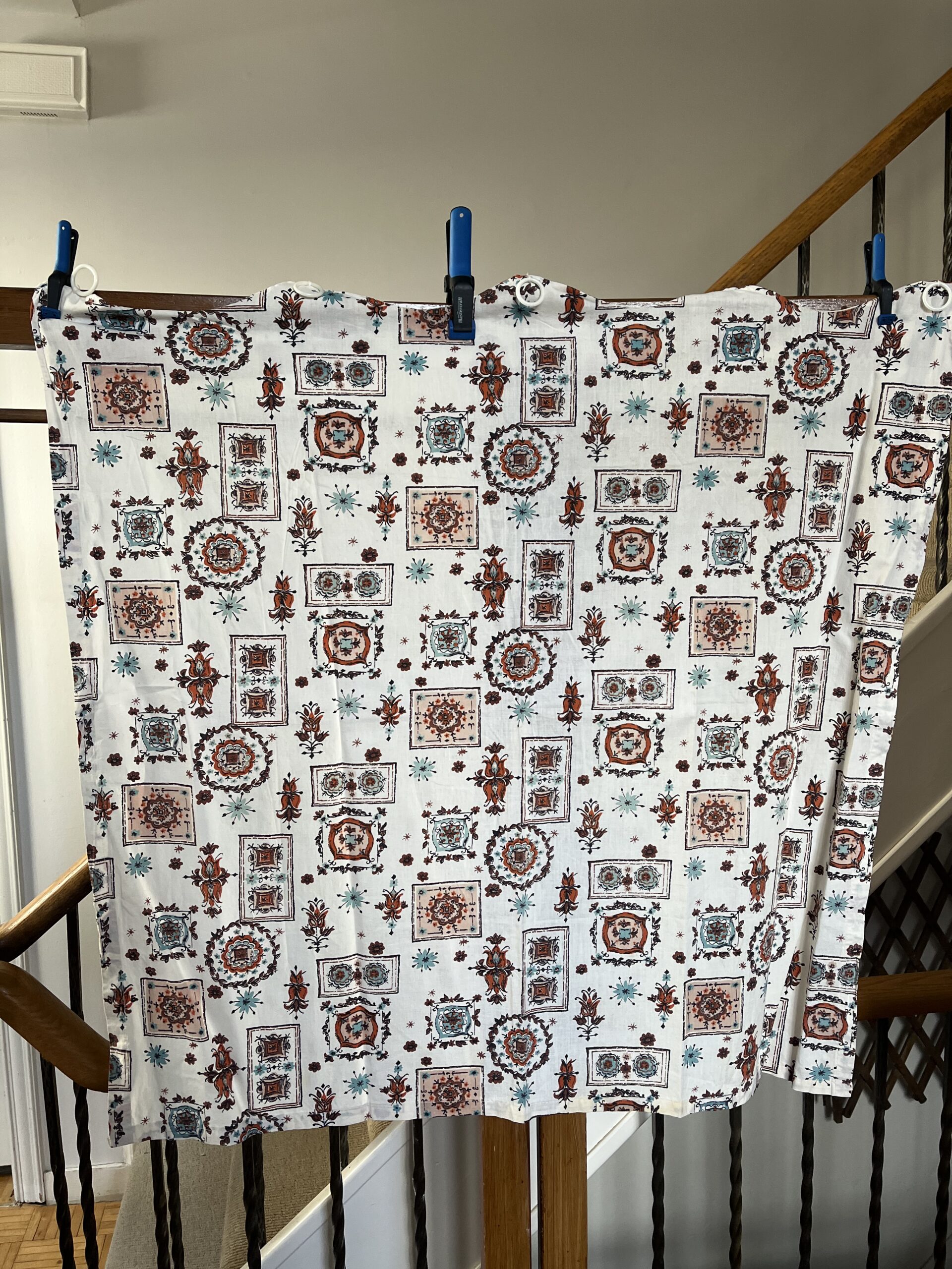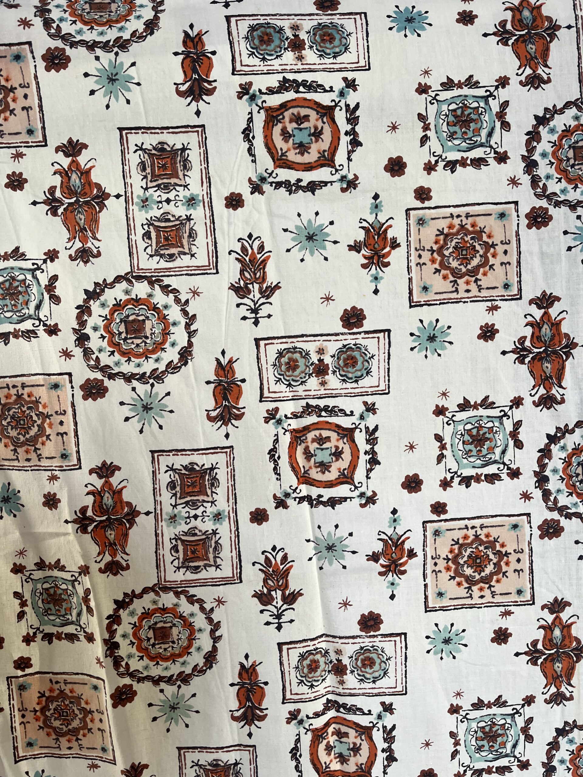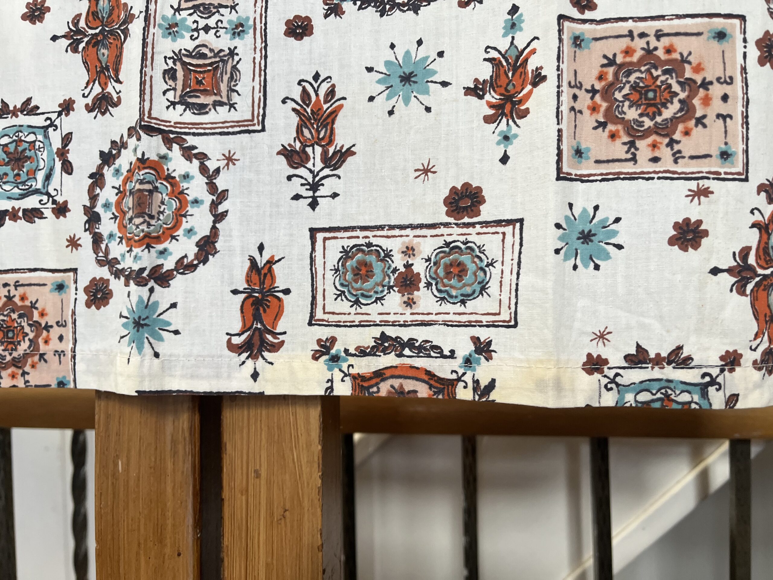1950s “WREATH BLOCK PRINT” short kitchen curtains w scalloped top, rings: in rust, beige, chocolate, turquoise, black, on cream backdrop.